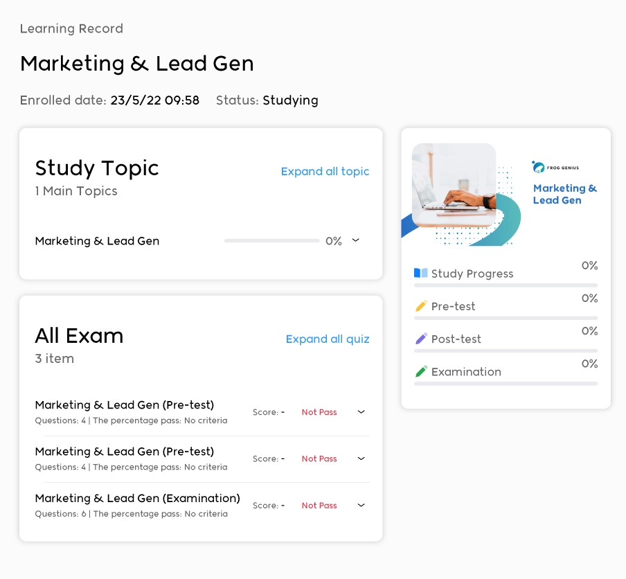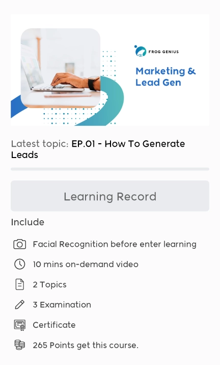 ระบบ FROG GENIUS LMS จะช่วยให้ตัวแทนขาย สามารถฝึกอบรมเกี่ยวกับ สินค้า หรือบริการ โปรโมชั่น รวมถึงวิธีการขายของบริษัทคุณได้อย่างถูกต้อง ตรวจสอบ วัดผลได้ และอบรมได้อย่างรวดเร็ว มั่นใจได้ว่าตัวแทนขายเหล่านั้น ได้ผ่านมาตรฐานการฝึกอบรม จนสามารถขายสินค้าหรือบริการของคุณ ได้เป็นอย่างดี ลดค่าใช้จ่ายเรื่องการเดินทางไปฝึกอบรม