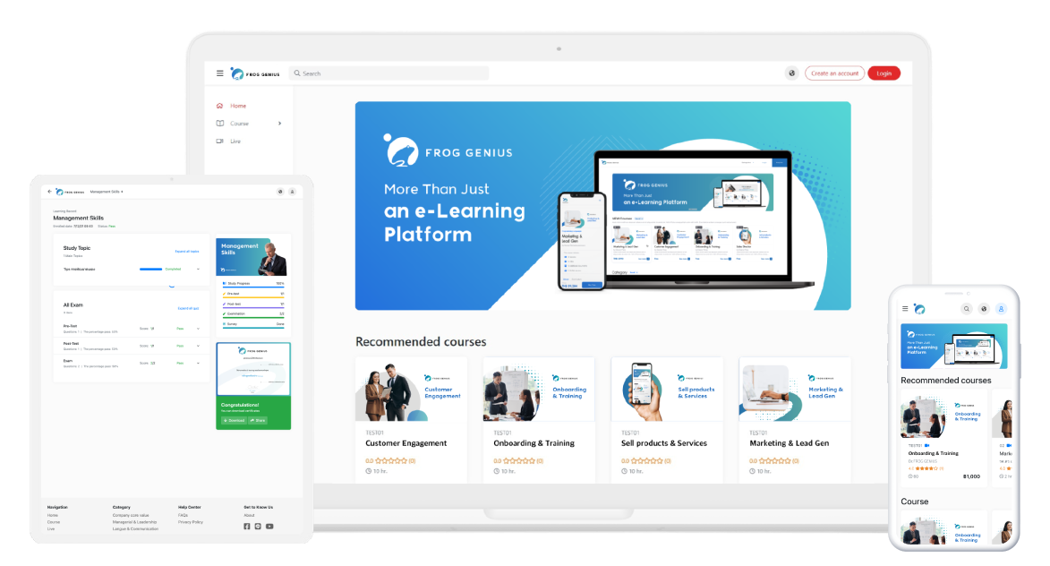 หากคุณขายสินค้า หรือ Software ที่ลูกค้าต้องเรียนรู้และสอบถาม เรื่องการใช้งานอยู่เป็นประจำ คุณสามารถให้บริการลูกค้าที่ต้องการฝึกอบรม ผ่าน Academy ของคุณเองได้ FROG GENIUS มีระบบสร้าง Online Academy ให้คุณพร้อมเก็บข้อมูลการเรียนรู้ของลูกค้า อีกทั้งยังเพิ่มความสนุกสนาน ในการฝึกอบรมลูกค้าด้วย Gamification และ Certificate ตอบโจทย์การเรียนรู้ ในรูปแบบใหม่
